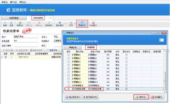 在功能導(dǎo)航窗點(diǎn)擊“往來管理”—》“收款結(jié)算單”即可打開“收款結(jié)算單列表”界面,然后打開一個(gè)收款結(jié)算單,如圖1所示,點(diǎn)擊“界面設(shè)計(jì)”,在系統(tǒng)彈出的界面設(shè)計(jì)窗口點(diǎn)擊“單據(jù)明細(xì)”,找到“本次結(jié)銷后余額”數(shù)據(jù)項(xiàng),勾選此數(shù)據(jù)項(xiàng)后,點(diǎn)擊“保存”按鈕。