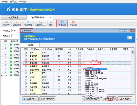 登錄軟件,在功能導航窗點“業務處理”,軟件最右側相關查詢統計中點擊“送貨明細對賬單”,即可進入“送貨明細對賬單”界面,如圖2所示,點擊“界面設計”按鈕,系統彈出界面設計窗口,找到“單據日期”這個數據項后,對應的日期格式選擇為“YYYY-MM-DD”。