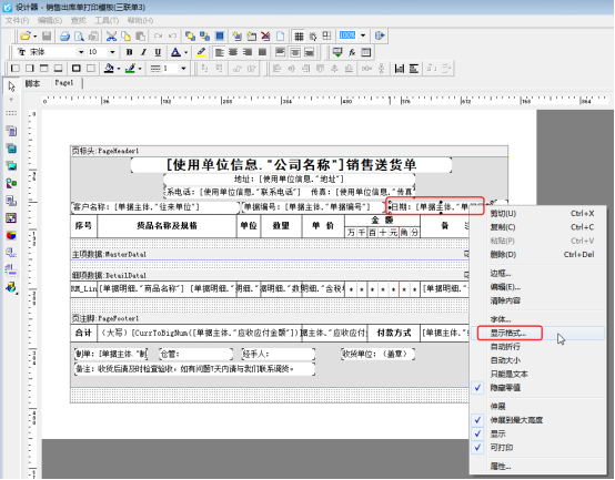 在開(kāi)好的單據(jù)界面點(diǎn)擊“打印”—》“打印格式設(shè)計(jì)”—》“設(shè)計(jì)格式”,進(jìn)入打印模板設(shè)計(jì)器界面,選擇單據(jù)日期文本框,鼠標(biāo)右鍵選擇“顯示格式”,如圖2所示。