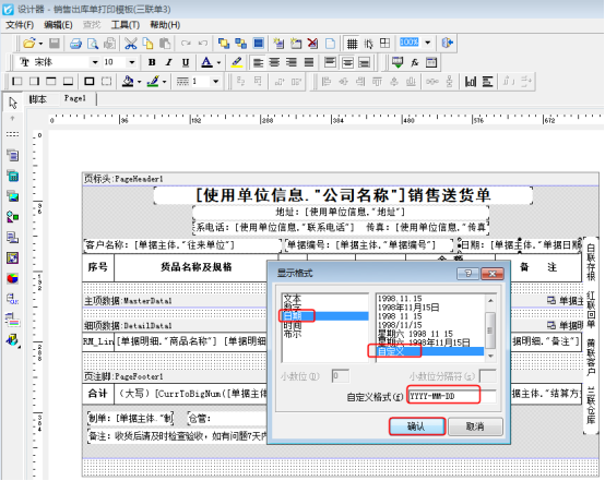 如果現(xiàn)有的日期格式都不能滿(mǎn)足您的需求,可以點(diǎn)擊“自定義”,如圖3所示,然后在自定義格式中輸入日期格式,例如“YYYY-MM-DD”,然后再點(diǎn)擊“確認(rèn)”按鈕,然后點(diǎn)擊預(yù)覽模板,可以看到單據(jù)日期“2018年04月04日”已修改為“2018-04-04”,如圖4所示。設(shè)置完成后,保存模板即可。