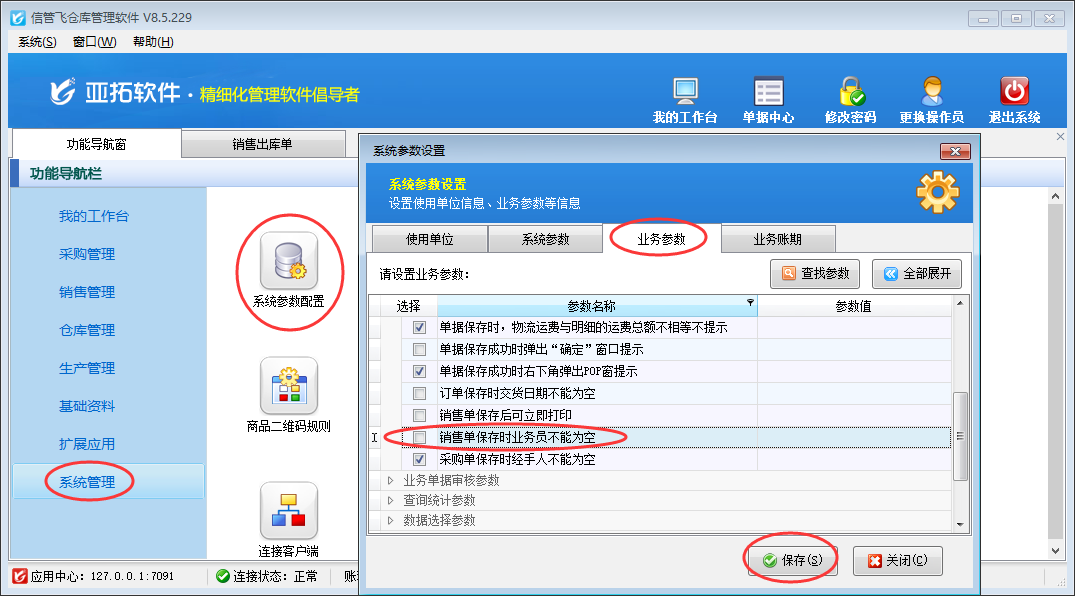 信管飛送貨單軟件、亞拓管理軟件、信管飛倉(cāng)庫(kù)管理軟件等支持開(kāi)銷售單時(shí)輸入業(yè)務(wù)員以區(qū)分單據(jù)是誰(shuí)所開(kāi)的,也有客戶開(kāi)單的時(shí)候不需要輸入業(yè)務(wù)員,對(duì)于不需要輸入業(yè)務(wù)員的需求,軟件支持設(shè)置系統(tǒng)參數(shù)來(lái)進(jìn)行控制業(yè)務(wù)員是否允許為空。