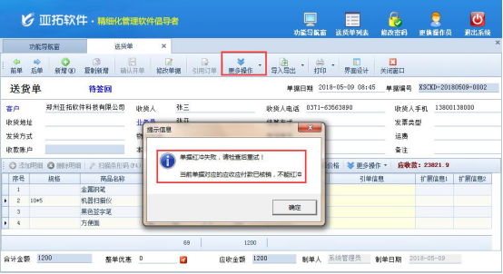 紅沖單據即作廢單據,有時單據已審核或對應應收款已結銷發現出現錯誤時,軟件支持把此單據進行紅沖操作。紅沖后的單據會變為無效,對應的應收應付款記錄會刪除,如果該單據已結銷應收款在紅沖此單據時會提示:“當前單據對應的應收應付款已核銷,不能紅沖”,如下圖1所示: