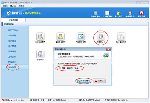 默認(rèn)初始化會(huì)刪除軟件內(nèi)所有數(shù)據(jù),我們可以根據(jù)自己的實(shí)際需要去選擇需要保留或刪除“基礎(chǔ)資料”,可打勾選擇要保留的數(shù)據(jù)內(nèi)容。點(diǎn)“開(kāi)始初始化”按鈕等待軟件執(zhí)行完成即可,如下圖2所示。