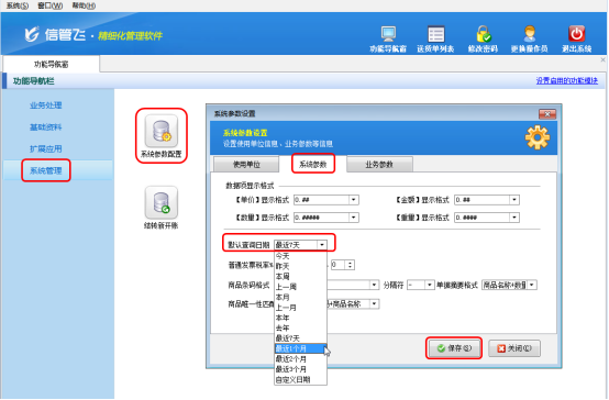 在功能導航窗點擊“系統管理”——》“系統參數配置”——》“系統參數”,在“系統參數”界面可以修改“默認查詢日期”(這里修改為“最近1個月”),修改完成之后點擊“保存”按鈕保存配置。