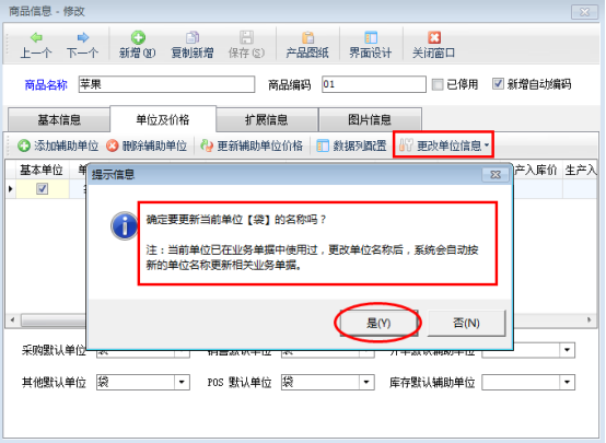 在圖3中,點擊“是”按鈕可以進行修改單位名稱,示例中是把單位“袋”修改為“箱”,修改后顯示為: