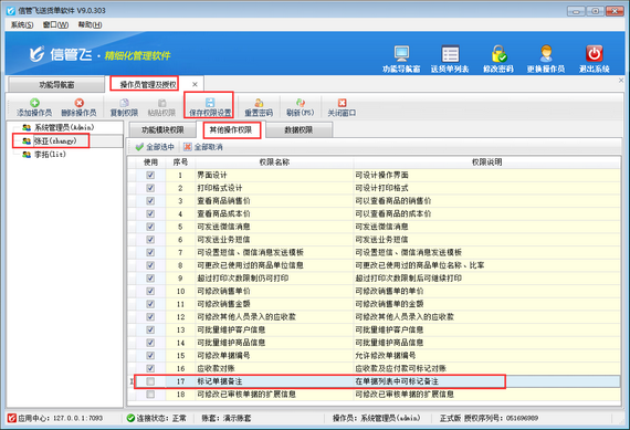 信管飛送貨單軟件支持對訂單列表、送貨單列表以及退貨單列表標(biāo)記備注。如果不允許操作員標(biāo)記單據(jù)備注,可以對操作員取消“標(biāo)記單據(jù)備注”的權(quán)限。下面我們介紹一下在信管飛送貨單軟件中設(shè)置操作員不可標(biāo)記單據(jù)備注的操作步驟。