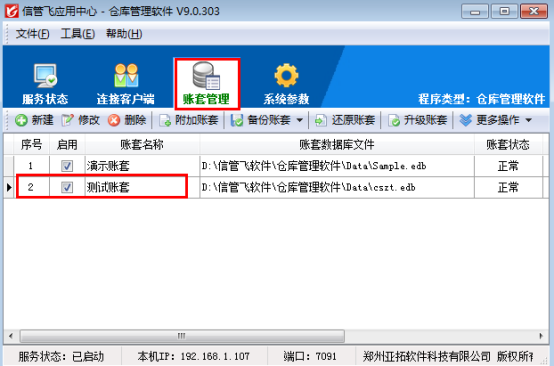 賬套即賬套數(shù)據(jù)庫(kù),這是一個(gè)從會(huì)計(jì)業(yè)務(wù)引申出來(lái)的概念,賬套數(shù)據(jù)庫(kù)中存儲(chǔ)業(yè)務(wù)數(shù)據(jù)。使用軟件前建議新增加一個(gè)賬套,用于重新錄入和管理數(shù)據(jù)。本軟件的賬套是集中在主機(jī)電腦上的應(yīng)用中心程序(紅色圖標(biāo))上進(jìn)行的。我們公司的信管飛RMS(進(jìn)銷存管理軟件)、信管飛送貨單軟件、信管飛出納記賬軟件、信管飛倉(cāng)庫(kù)管理軟件等都支持新建多賬套使用,可以同時(shí)管理多個(gè)賬套。