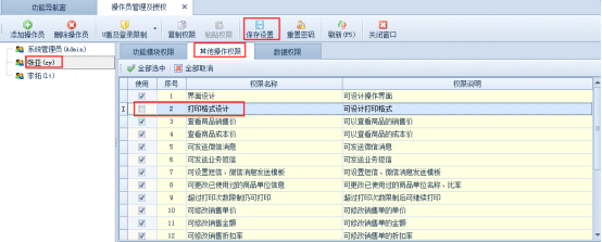 此處設置好后,點擊“其他操作權限”,把“打印格式設計”權限取消勾選,保存操作員權限,如下圖2所示: