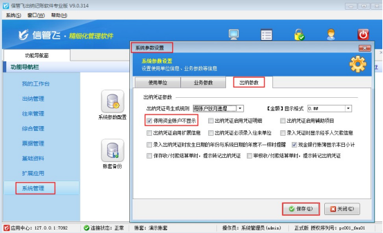 在功能導航窗選擇“系統管理”—》“系統參數配置”—》“出納參數”,在“出納參數”界面把“停用資金賬戶不顯示”勾選啟用,然后保存參數配置,如下圖2所示: