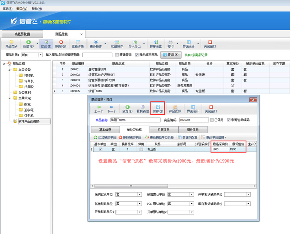 在功能導(dǎo)航窗點(diǎn)擊“基礎(chǔ)資料”—》“商品信息”即可打開(kāi)“商品信息”界面,然后選擇商品,點(diǎn)擊“修改”按鈕,在“單位及價(jià)格”標(biāo)簽頁(yè)可設(shè)置商品“最高采購(gòu)價(jià)”及“最低售價(jià)”,如下圖一所示,設(shè)置商品“信管飛RMS”最高采購(gòu)價(jià)為1900元,最低售價(jià)為1990元。