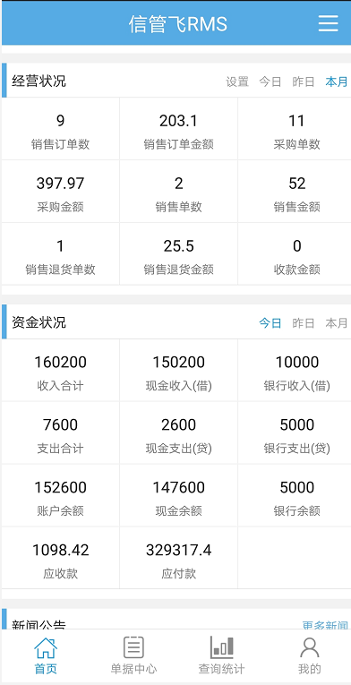 信管飛RMS支持手機APP登錄進行業務開單、庫存查詢等操作,另外在APP首頁也可以查看經營狀況及資金狀況,如下圖所示。如果需要設置操作員賬號登錄不可在APP首頁查看資金狀況,如何設置呢?下面詳細介紹一下操作過程。