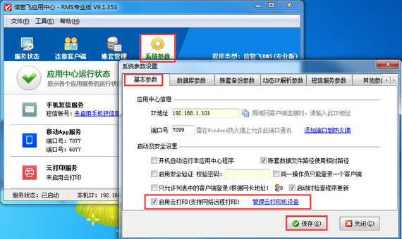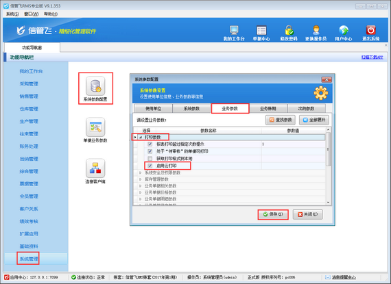 云打印機設(shè)備設(shè)置完成后,登錄軟件,需要設(shè)置云打印參數(shù),在功能導(dǎo)航窗點擊“系統(tǒng)管理”->“系統(tǒng)參數(shù)設(shè)置”->“業(yè)務(wù)參數(shù)”打開業(yè)務(wù)參數(shù)設(shè)置窗口,在“打印參數(shù)”內(nèi)打鉤啟用“啟用云打印”參數(shù),然后點擊“保存”按鈕保存設(shè)置,如下圖三所示。