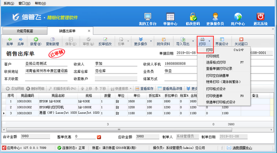 設(shè)置完成后,操作員登錄軟件打印單據(jù)時即可選擇使用云打印機進行打印單據(jù)。點擊“銷售管理”->“銷售出庫單”,新增一個銷售出庫單并打印,打印時可選擇使用云打印機或者本地打印機進行打印,如下圖四、圖五、圖六所示。