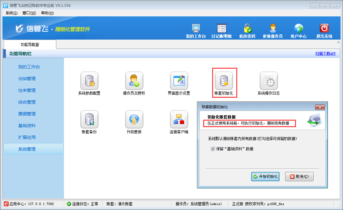 執(zhí)行賬套初始化操作后,會刪除賬套內(nèi)相應(yīng)的數(shù)據(jù),因此務(wù)必提前做好備份,謹慎操作!為了避免操作員誤操作,導(dǎo)致數(shù)據(jù)丟失,軟件內(nèi)支持設(shè)置操作員不可進行賬套初始化操作,下面以信管飛出納記賬軟件專業(yè)版為例來演示一下具體的操作步驟。