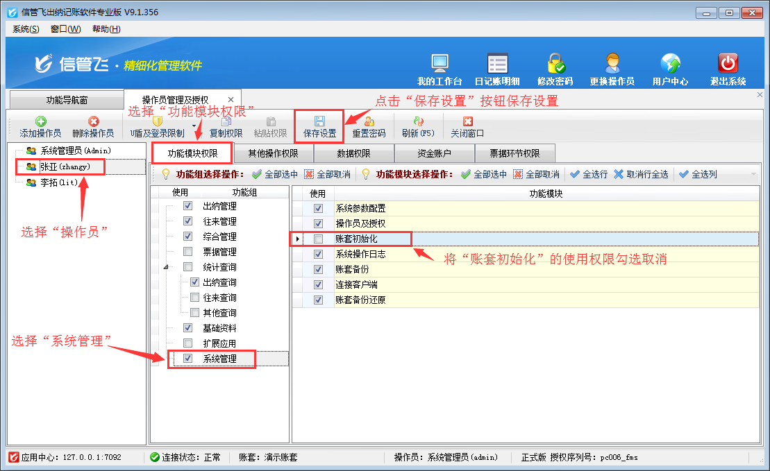 登錄軟件,在功能導(dǎo)航窗點擊“系統(tǒng)管理”—》“操作員及授權(quán)”,進入“操作員管理及授權(quán)”界面,選擇操作員“張亞”,在其右側(cè)的功能模塊權(quán)限內(nèi)選擇“系統(tǒng)管理”模塊,將賬套初始化的“使用”權(quán)限勾選取消,然后保存設(shè)置,如下圖所示。