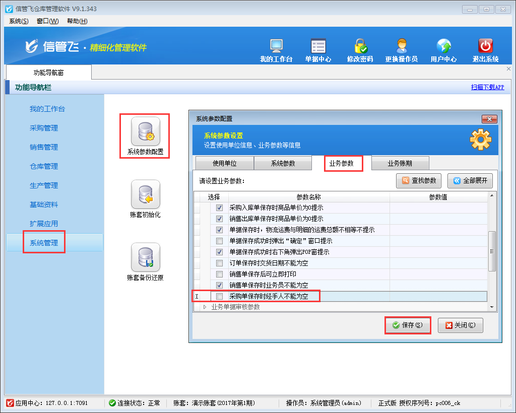在功能導(dǎo)航窗中點(diǎn)擊“系統(tǒng)管理”—》“系統(tǒng)參數(shù)配置”,即可進(jìn)入“系統(tǒng)參數(shù)設(shè)置”界面,點(diǎn)擊“業(yè)務(wù)參數(shù)”,如圖1所示,在業(yè)務(wù)單據(jù)保存參數(shù)內(nèi)找到“采購(gòu)單保存時(shí)經(jīng)手人不能為空”參數(shù),把這個(gè)參數(shù)的勾選去掉,然后保存。