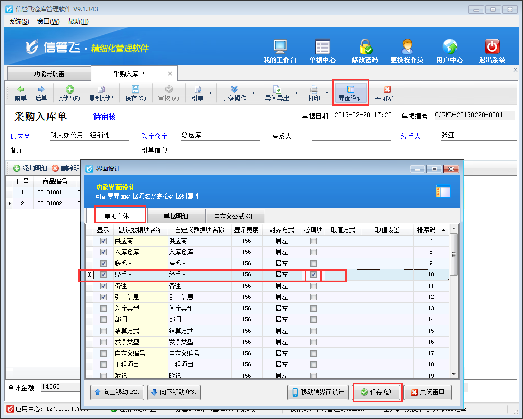 參數(shù)保存后,在功能導(dǎo)航窗點(diǎn)擊“采購(gòu)管理”—》“采購(gòu)入庫(kù)單”,新增采購(gòu)入庫(kù)單,如果未輸入經(jīng)手人保存單據(jù)時(shí)仍提示“數(shù)據(jù)項(xiàng)[經(jīng)手人]不能為空,請(qǐng)輸入!”,可檢查下開(kāi)單界面的“界面設(shè)計(jì)—》單據(jù)主體”中經(jīng)手人數(shù)據(jù)項(xiàng)是否勾選為必填項(xiàng),如勾選可取消勾選保存配置,如下圖2所示: