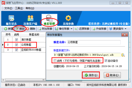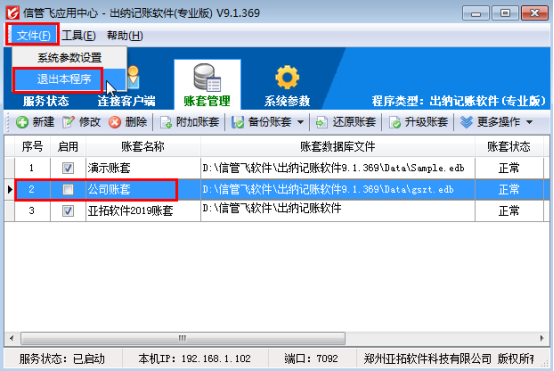 亞拓軟件旗下的信管飛RMS、信管飛倉庫管理軟件、信管飛送貨單軟件、信管飛出納記賬軟件、信管飛票據打印軟件等軟件程序安裝后會顯示兩個圖標,一個是應用中心程序(紅色圖標),一個是客戶端程序(藍色圖標)。這些軟件都含有賬套管理功能,在應用中心里面可以建立多個賬套,已使用的帳套如果不再繼續使用,可以停用帳套,停用帳套后,客戶端程序登錄時無法連接該帳套。我們以信管飛出納記賬軟件專業版為例演示一下如何停用帳套。