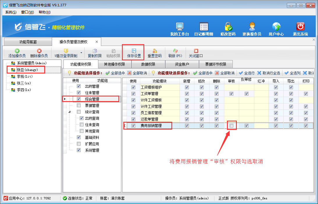 在功能導航窗點擊“系統管理”—》“操作員及授權”打開操作員管理及授權界面,選擇操作員“張亞”,在功能模塊權限界面,選擇“綜合管理”—》“費用報銷管理”,把費用報銷管理“審核”權限勾選取消后保存權限,如下圖一所示: