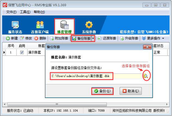 備份是在電腦的紅色應用中心程序(應用中心程序打開會在電腦桌面右下角顯示)上操作,打開紅色應用中心程序,點擊“賬套管理”界面,選擇需要備份的賬套,點擊工具欄“備份賬套”,可以選擇備份的保存路徑,為了方便復制備份數據,可以把備份文件保存在電腦桌面上,如下圖所示: