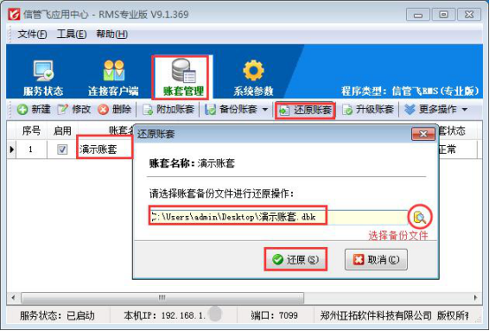 點擊“備份”后,賬套備份數據保存在桌面上,備份數據名字為“演示賬套.dbk”(可自己取名字),把這個賬套備份數據復制到新電腦的桌面上,新電腦需要提前安裝好軟件,軟件安裝包可到信管飛軟件官網上下載(軟件下載地址),然后進行備份數據還原操作,還原操作也是在應用中心程序上,在“賬套管理”界面選擇賬套后(沒有賬套可以先新建賬套)點擊“還原賬套”選擇桌面上的賬套備份數據:演示賬套.dbk,點擊還原后,數據就會恢復到新電腦上,如下圖所示: