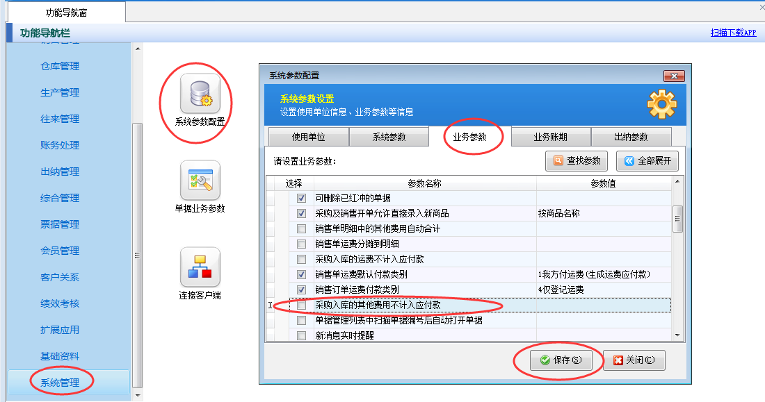 在功能導(dǎo)航窗點(diǎn)擊“系統(tǒng)管理”—》“系統(tǒng)參數(shù)配置”—》“業(yè)務(wù)參數(shù)”,即可進(jìn)入到“業(yè)務(wù)參數(shù)”配置界面,在業(yè)務(wù)單據(jù)相關(guān)參數(shù)內(nèi)將“采購(gòu)入庫(kù)的運(yùn)費(fèi)不計(jì)入應(yīng)付款”參數(shù)的勾選取消,設(shè)置完成后點(diǎn)擊“保存”按鈕保存配置,如下圖一所示。
