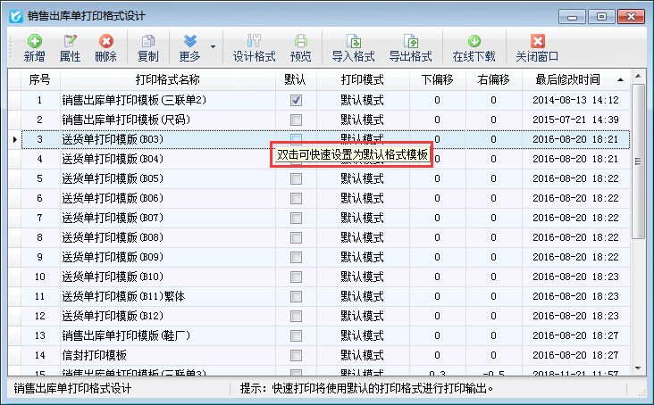二、在默認框中雙擊快速設置為默認模板,在打印模板后邊的默認選擇框中,雙擊此處可以快速把模板設置為默認格式模板,如下所示: