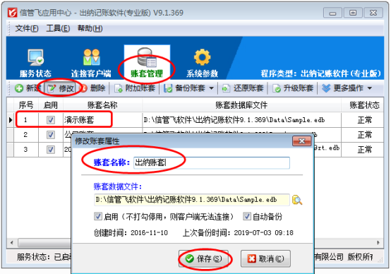 以“信管飛出納記賬軟件”為例,示范下如何修改賬套的名稱。打開紅色的應(yīng)用中心程序(應(yīng)用中心運(yùn)行后桌面右下角會(huì)顯示相應(yīng)的圖標(biāo),點(diǎn)擊即可打開應(yīng)用中心主界面),在賬套管理界面,點(diǎn)擊賬套后選擇工具欄中的“修改”按鈕,彈出“修改賬套屬性”界面,把“演示賬套”修改為“出納賬套”,然后點(diǎn)擊“保存”按鈕,如下圖1所示: