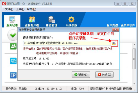信管飛送貨單軟件、信管飛RMS軟件、信管飛倉庫管理軟件等都支持網絡版本(即可以多臺機器同時使用,數據共享,數據集中存儲在一臺機器上),軟件會不定期更新新版本,網絡版多臺電腦使用的時候,每次更新程序需要每臺電腦都下載最新版安裝程序進行安裝,非常麻煩。軟件支持在主機電腦的應用中心程序上指定更新安裝程序,便于客戶端登錄的時候如版本不一致會提示直接下載安裝程序。