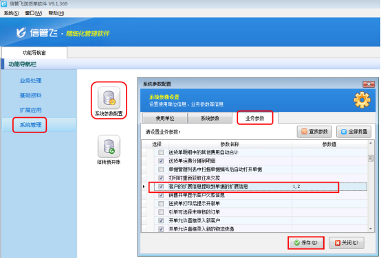 在功能導(dǎo)航窗點(diǎn)“系統(tǒng)管理”—》“系統(tǒng)參數(shù)配置”即可進(jìn)入“系統(tǒng)參數(shù)配置”界面,在業(yè)務(wù)參數(shù)頁(yè)面勾選“客戶(hù)的擴(kuò)展信息提取到單據(jù)的擴(kuò)展信息”,在這一行的后面輸入相應(yīng)提取的擴(kuò)展信息編號(hào),例如,提取擴(kuò)展信息1和擴(kuò)展信息2,則需要輸入“1,2”,用英文的逗號(hào)間隔,設(shè)置后點(diǎn)擊“保存”按鈕。