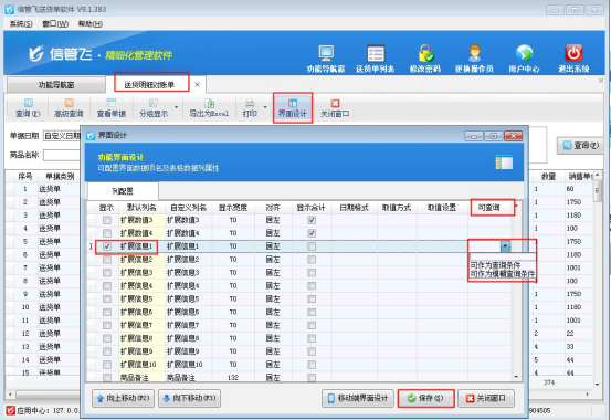 以“送貨明細對賬單”為例,示范下如何在界面設計中配置。功能導航窗選擇“業務處理”在右側的查詢統計下打開“送貨明細對賬單”進入送貨明細對賬單界面,點擊“界面設計”按鈕,在打開的界面設計窗口中找到“擴展信息1”數據項,勾選顯示并在可查詢處設置“可作為查詢條件”,然后保存設置,如下圖所示: