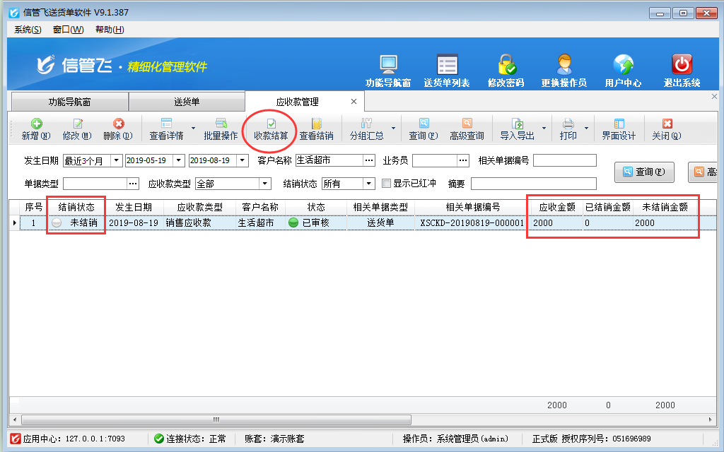 收款結算單用來登記收款信息(收款對象即客戶、收款賬戶、收款金額、經手人等),并結銷應收款記錄。本篇文章以送貨單打印軟件為例演示一下對應收款進行收款結算的操作步驟。
