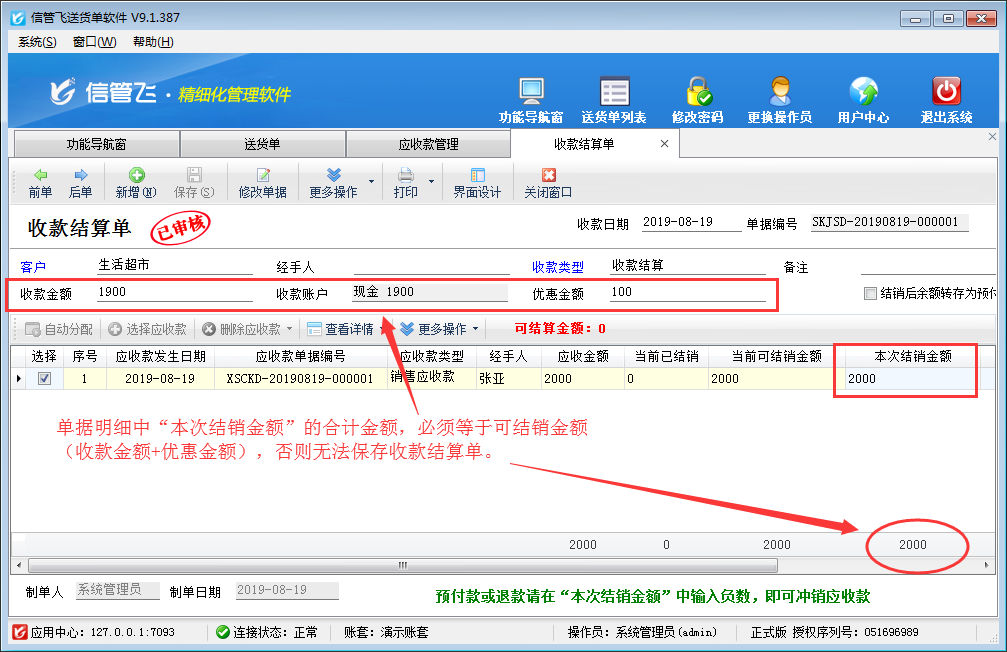 注意:收款結算單單據明細中“本次結銷金額”的合計金額,必須等于可結銷金額(收款金額 + 優惠金額),否則無法保存收款結算單。