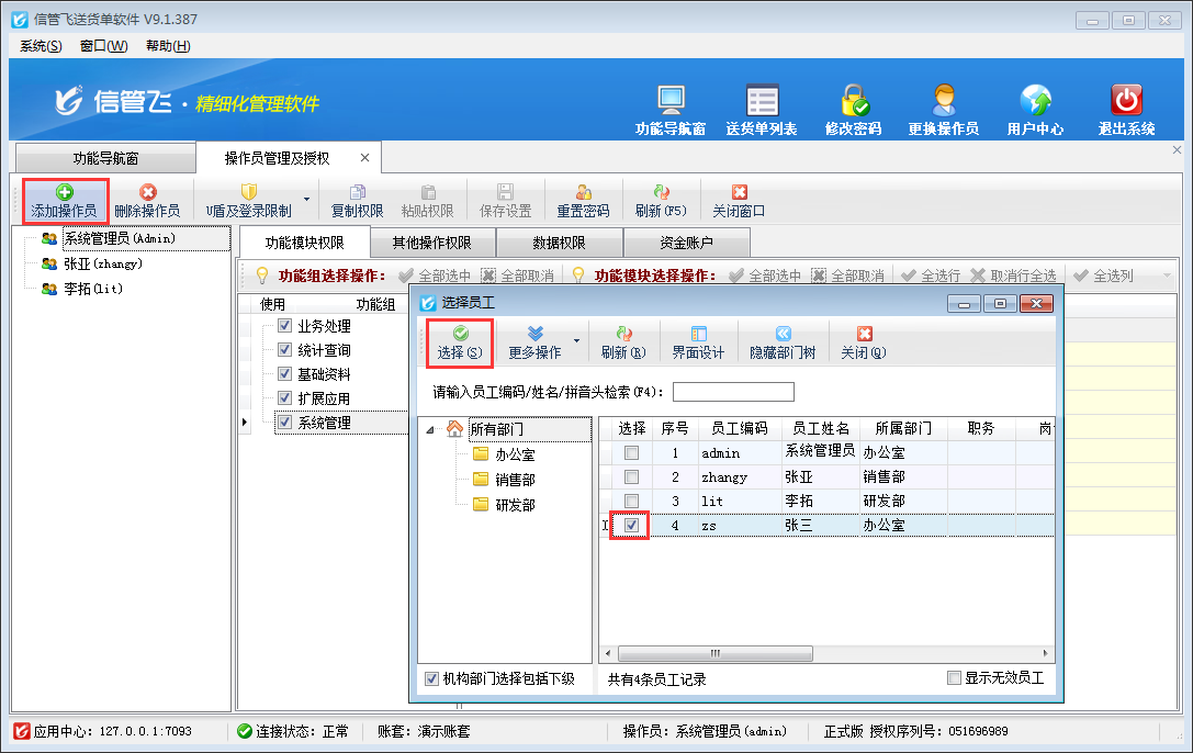 添加操作員:可以將“員工信息”中的員工設置為操作員,支持批量設置。點擊“添加操作員”按鈕,然后在打開的“選擇員工”窗口勾選相應的員工后點擊“選擇”按鈕添加操作員。