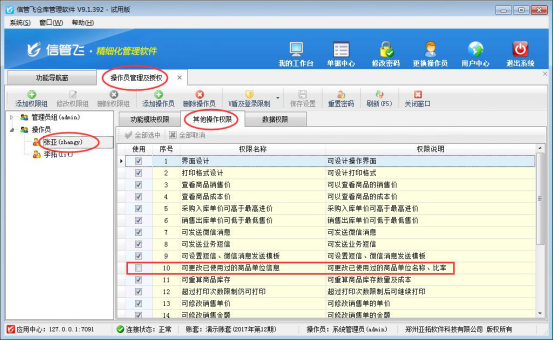 在功能導航窗點“系統管理”—》“操作員及授權”進入“操作員管理及授權”界面,選中示例操作員組的操作員賬號“張亞”,在“其他操作權限”界面將“可更改已使用過的商品單位信息”權限打鉤取消,如下圖一所示,設置操作員賬號“張亞”不可更改已使用過的商品單位信息,設置完成后點擊“保存權限設置”按鈕保存設置。