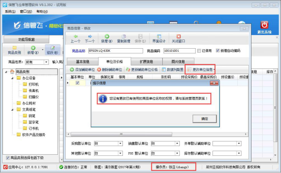 權限保存完成后,使用操作員“張亞”登錄軟件,在“基礎資料”—》“商品信息”界面,選擇一個已開單據的商品信息,進行修改商品單位信息操作,系統會提示“您沒有更改已有使用的商品單位名稱的權限,請與系統管理員聯系!”,如下圖二所示: