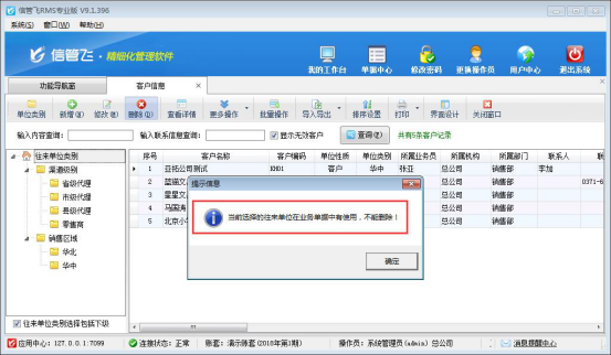 信管飛RMS軟件是集采購管理、銷售管理、庫存管理、往來賬管理等為一體的進銷存管理軟件。經常會有用戶問到刪除客戶資料時會彈出提示信息:“當前選擇的往來單位在單據中有使用,不能刪除”(如下圖一所示),刪除不了,為什么?