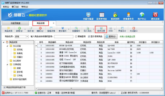 信管飛送貨單軟件、信管飛倉庫管理軟件、信管飛RMS軟件開單時(shí)都可以直接從商品信息中選擇已有的商品進(jìn)行快速開單,軟件都支持對商品信息進(jìn)行排序。開單添加明細(xì)時(shí)彈出的“選擇商品”窗口中商品信息顯示的先后順序如果需要調(diào)整,可以到商品信息中調(diào)整。下面我們以信管飛送貨單軟件為例介紹一下對商品信息排序的操作方法。