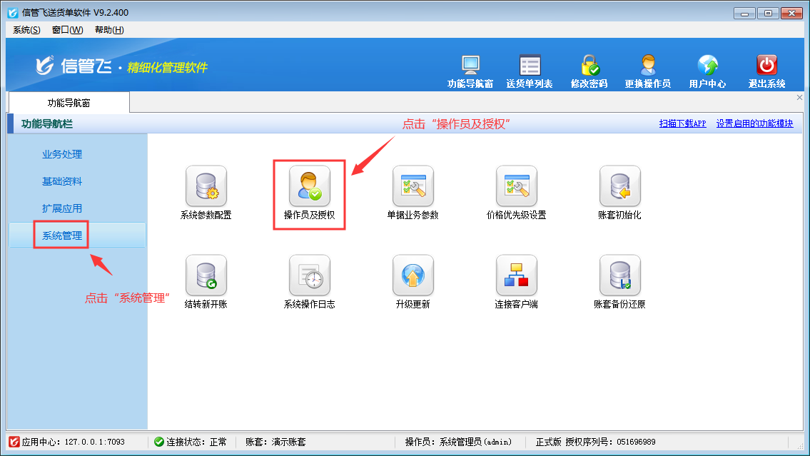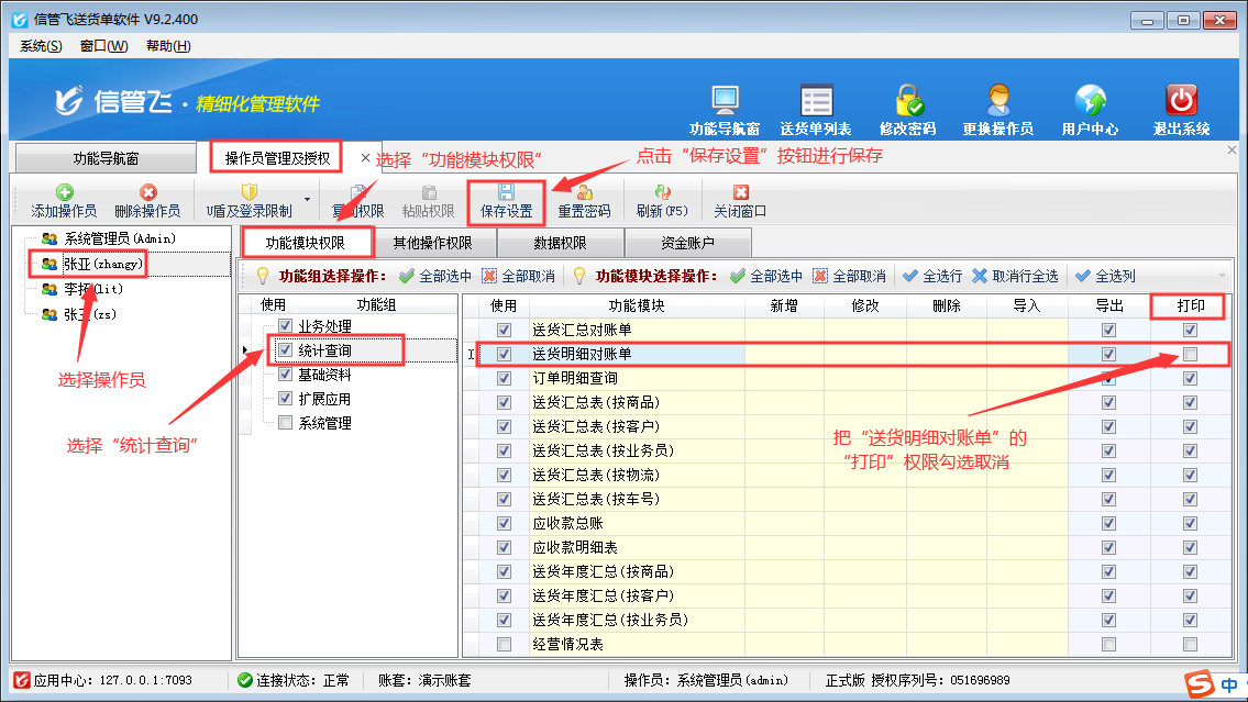 登錄軟件,在功能導(dǎo)航窗點擊“系統(tǒng)管理”—》“操作員及授權(quán)”,進入“操作員管理及授權(quán)”界面,選擇操作員“張亞”,在其右側(cè)的功能模塊權(quán)限內(nèi)選擇“統(tǒng)計查詢”模塊,將送貨明細對賬單的“打印”權(quán)限勾選取消,然后保存設(shè)置,如下圖所示: