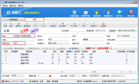 本文以方式①為例,首先新開訂單,在訂單界面,選擇客戶和商品明細后,在預收定金中輸入客戶預付的定金,如下圖所示: