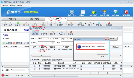 信管飛RMS軟件是集“采購(gòu)管理、銷售管理、庫(kù)存管理、往來(lái)賬管理”一體的進(jìn)銷存軟件,軟件可引用訂單生成對(duì)應(yīng)的采購(gòu)入庫(kù)單和銷售出庫(kù)單。軟件默認(rèn)引用訂單需要訂單處于審核狀態(tài),否則引用不了(如下圖所示),有的客戶存引用未審核的訂單,本文示范下如何設(shè)置?