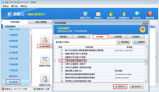 在功能導(dǎo)航窗點(diǎn)擊“系統(tǒng)管理”→“系統(tǒng)參數(shù)配置”→“業(yè)務(wù)參數(shù)”可以打開“業(yè)務(wù)參數(shù)”配置界面,在業(yè)務(wù)單據(jù)相關(guān)參數(shù)內(nèi)打鉤啟用“引單可選擇未審核的訂單”參數(shù),然后點(diǎn)擊“保存”按鈕保存設(shè)置,如下圖所示: