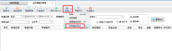 然后在工具欄點擊“打印”—》“打印格式設計”打開“送貨明細對賬單列表打印”窗口,如下圖所示: