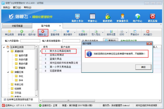 信管飛倉庫管理軟件是集采購管理、銷售管理、庫存管理為一體的進銷存管理軟件。經常會有用戶問到刪除客戶資料時會彈出提示信息:“當前選擇的往來單位在單據中有使用,不能刪除”(如下圖所示),刪除不了,為什么?