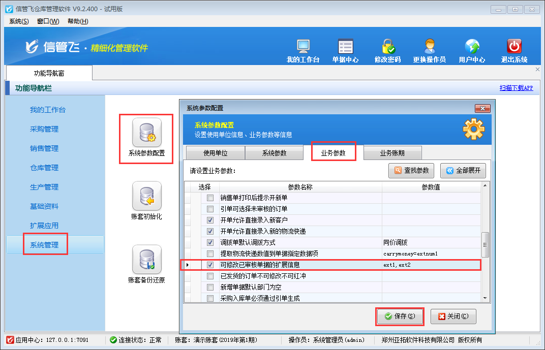 在功能導航窗點擊“系統(tǒng)管理”—》“系統(tǒng)參數(shù)設置”—》“業(yè)務參數(shù)”可以進入到“業(yè)務參數(shù)”配置界面,在業(yè)務單據(jù)相關參數(shù)內打勾啟用“可修改已審核單據(jù)的擴展信息”參數(shù),并設置參數(shù)值(單據(jù)主體擴展信息字段名),默認為“ext1,ext2(擴展信息1,擴展信息2)”,如下圖所示。