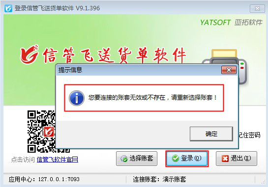 部分客戶有時(shí)存在不正常退出情況,重新登錄軟件時(shí)提示“您要選擇的賬套無效或不存在”,如下圖所示: