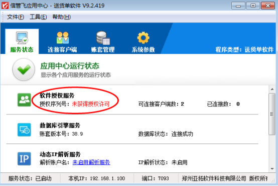 二、打開軟件應用中心程序(紅色圖標),可先查看服務狀態下的“軟件授權服務”,如果授權序列號顯示“未獲得授權許可”,如下圖所示: