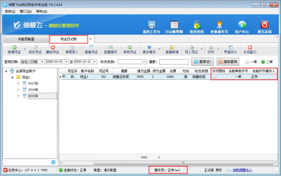 操作員“張亞”登錄軟件,在現金日記賬中找到剛才一審的現金日記賬,點擊“審核”,可看到“當前審核環節”變為“二審”如下圖所示: