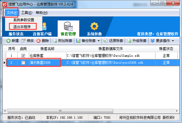 信管飛RMS、信管飛倉庫管理軟件、信管飛送貨單軟件、信管飛出納記賬軟件、信管飛票據(jù)打印軟件等軟件都含有賬套管理功能,在應(yīng)用中心內(nèi)支持建立多個賬套,已使用的帳套如果不再繼續(xù)使用,可以停用帳套,停用帳套后,客戶端程序登錄時將無法再連接該帳套。本文我們以信管飛倉庫管理軟件為例演示一下如何停用帳套。