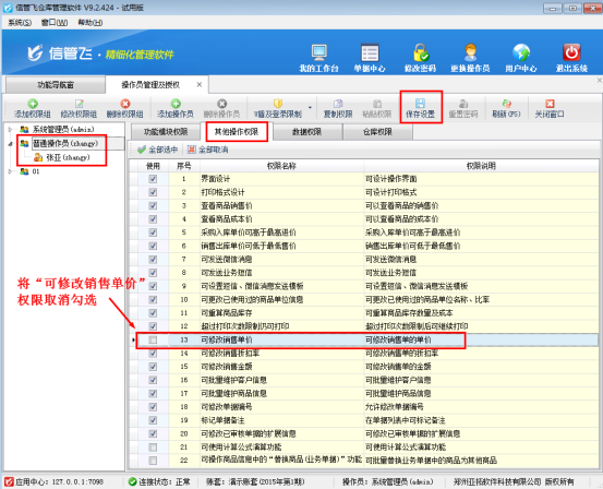 在功能導航窗選擇“系統管理”—》“操作員及授權”,進入操作員管理及授權界面,以操作員“張亞”為例,選擇操作員后,點擊“其他操作權限”,取消勾選“可修改銷售單價”,然后保存設置,如圖1所示。